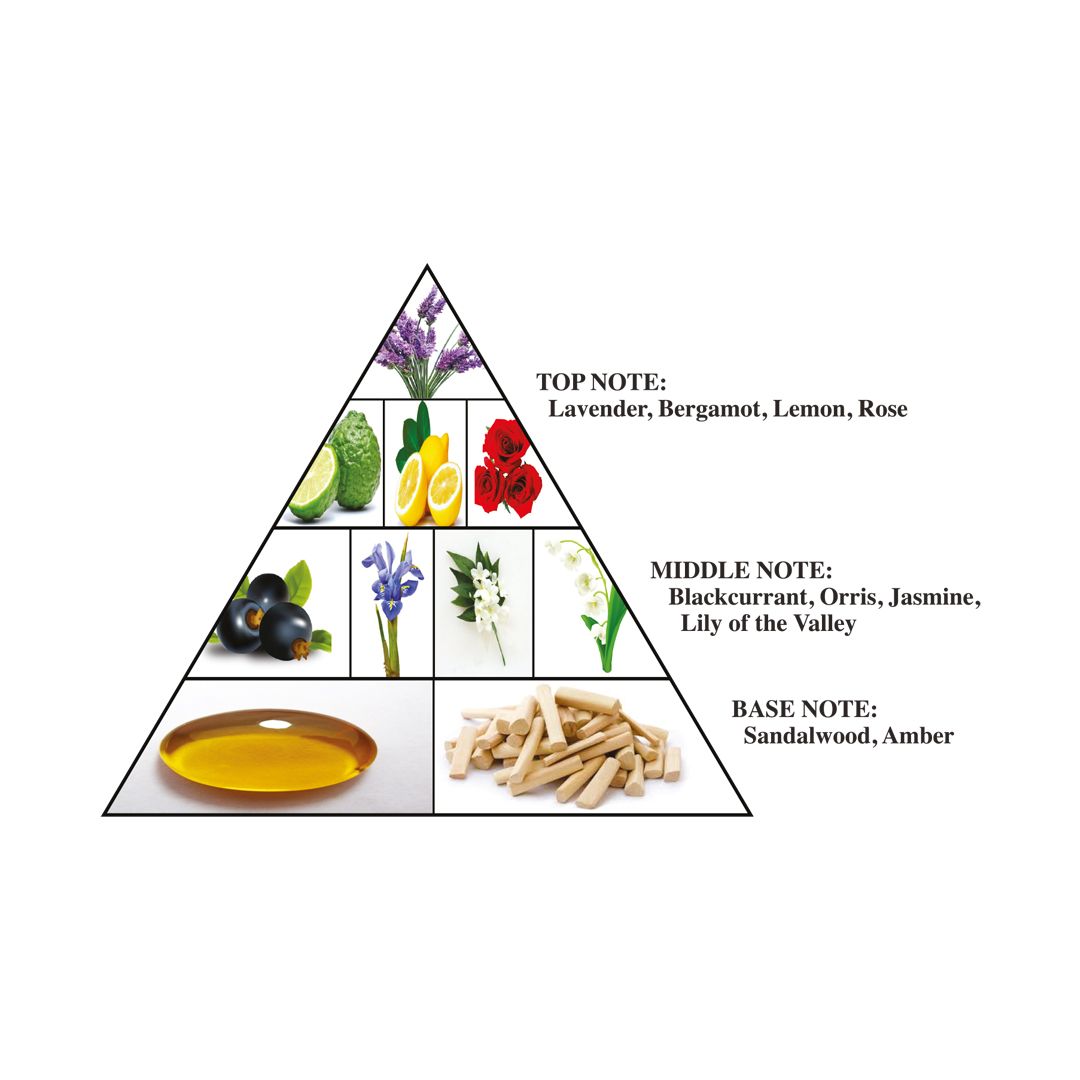 ~Top notes: Bergamot, Lemon, Lavender and Rose, ~Middle notes: Black Currant, Jasmine, Lily-of-the-Valley and Orris, and ~Base notes: Sandalwood and Amber